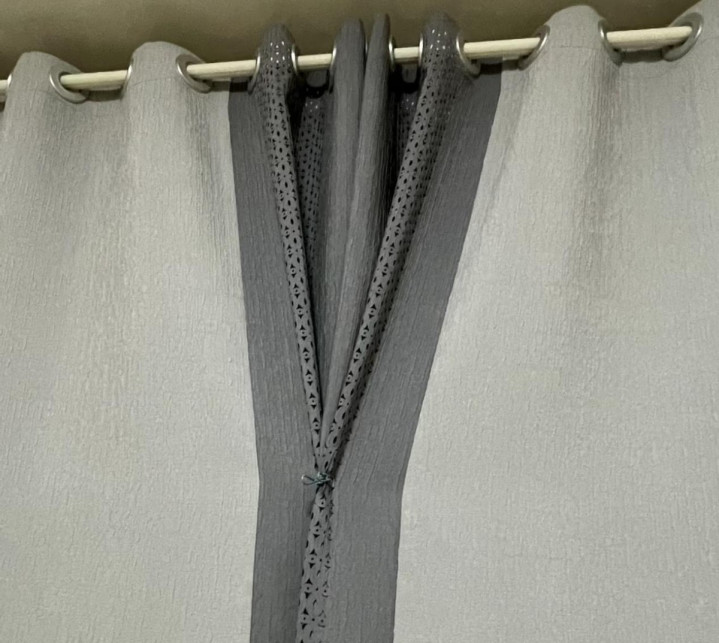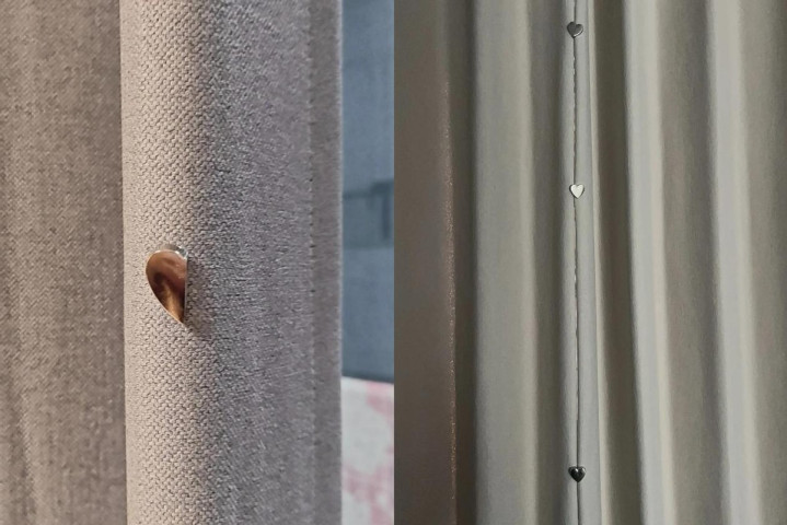 就两片小小的磁铁,两边窗帘各吸一片,窗帘一拉就自动吸住了,特别严实。