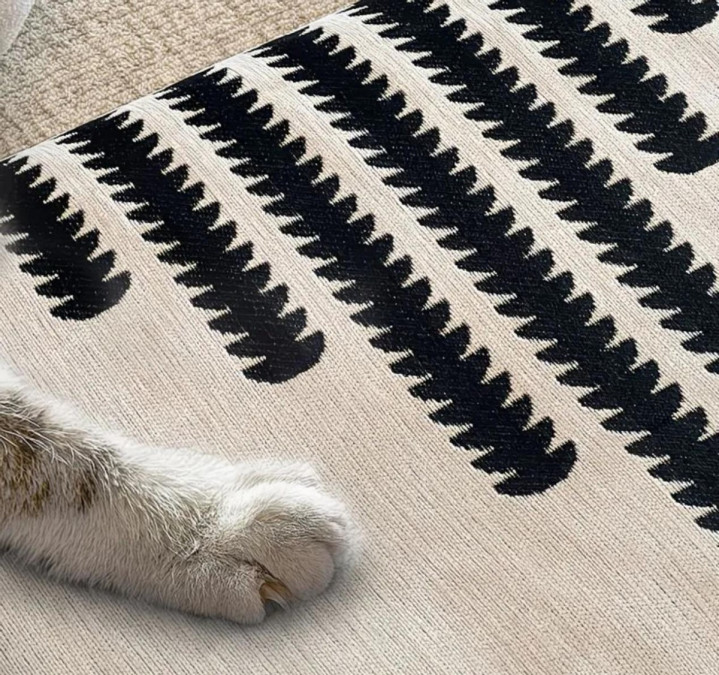它质地厚实柔软,铺在沙发上垂感很好,黑白的几何图案简单时尚。
