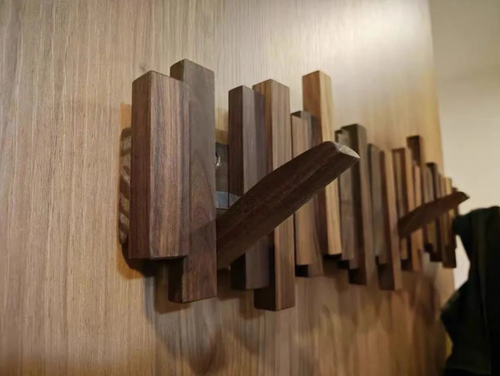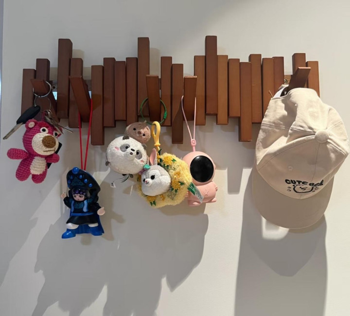 它是实木质地的,高级简单的同时,非常有设计感,错落有致的琴键形挂钩,挂在墙上本身就是一件装饰品。