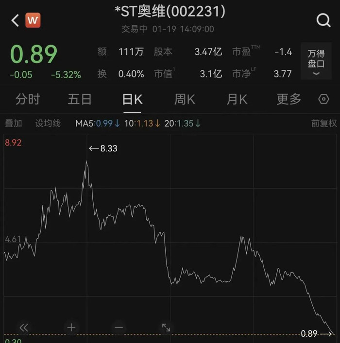 《每日经济新闻》记者注意到,自1月14日起,公司股价连续四个交易日一字跌停,股价已跌至2008年上市以来最低点。1月19日开盘,公司股价维持一字跌停,截至发稿,报0.89元/股。